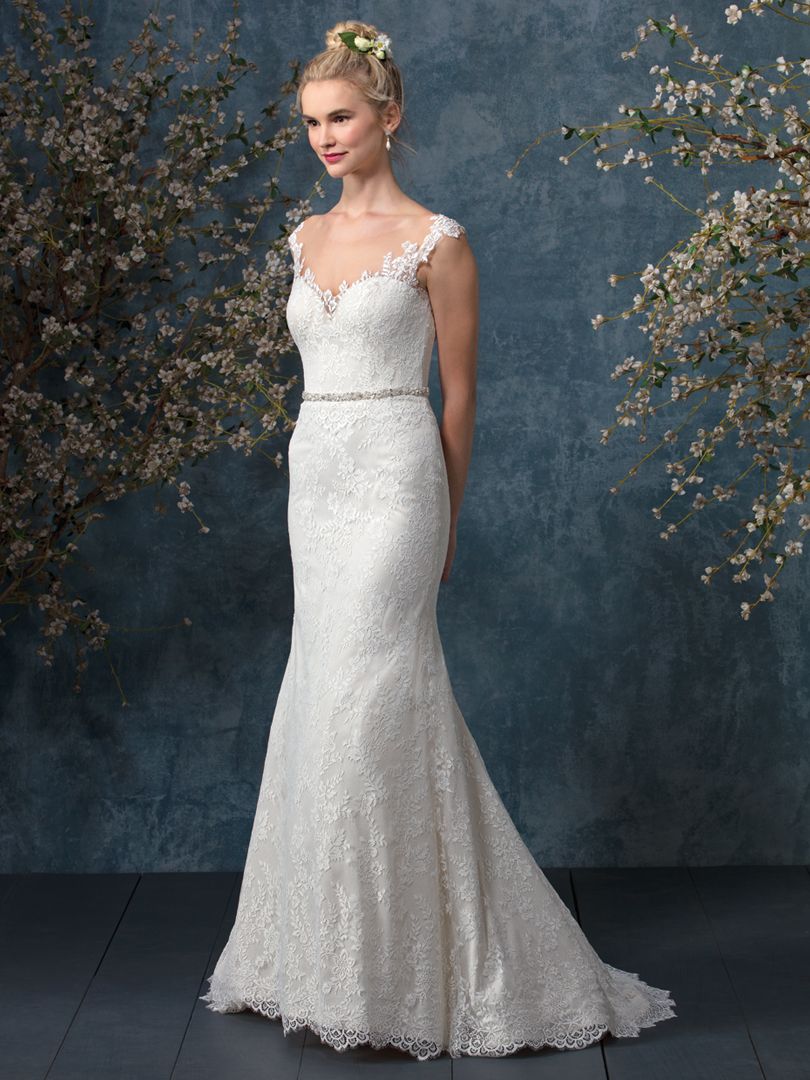 A delicate Chantilly lace teeming with floral emblems is the perfect textile for style BL242 Cobalt. A bride’s face will be framed beautifully by the illusion bateau neckline, while the dainty cap sleeves and semi-cathedral length train are other notable aspects of this gown. Shown in Light Champagne/Ivory