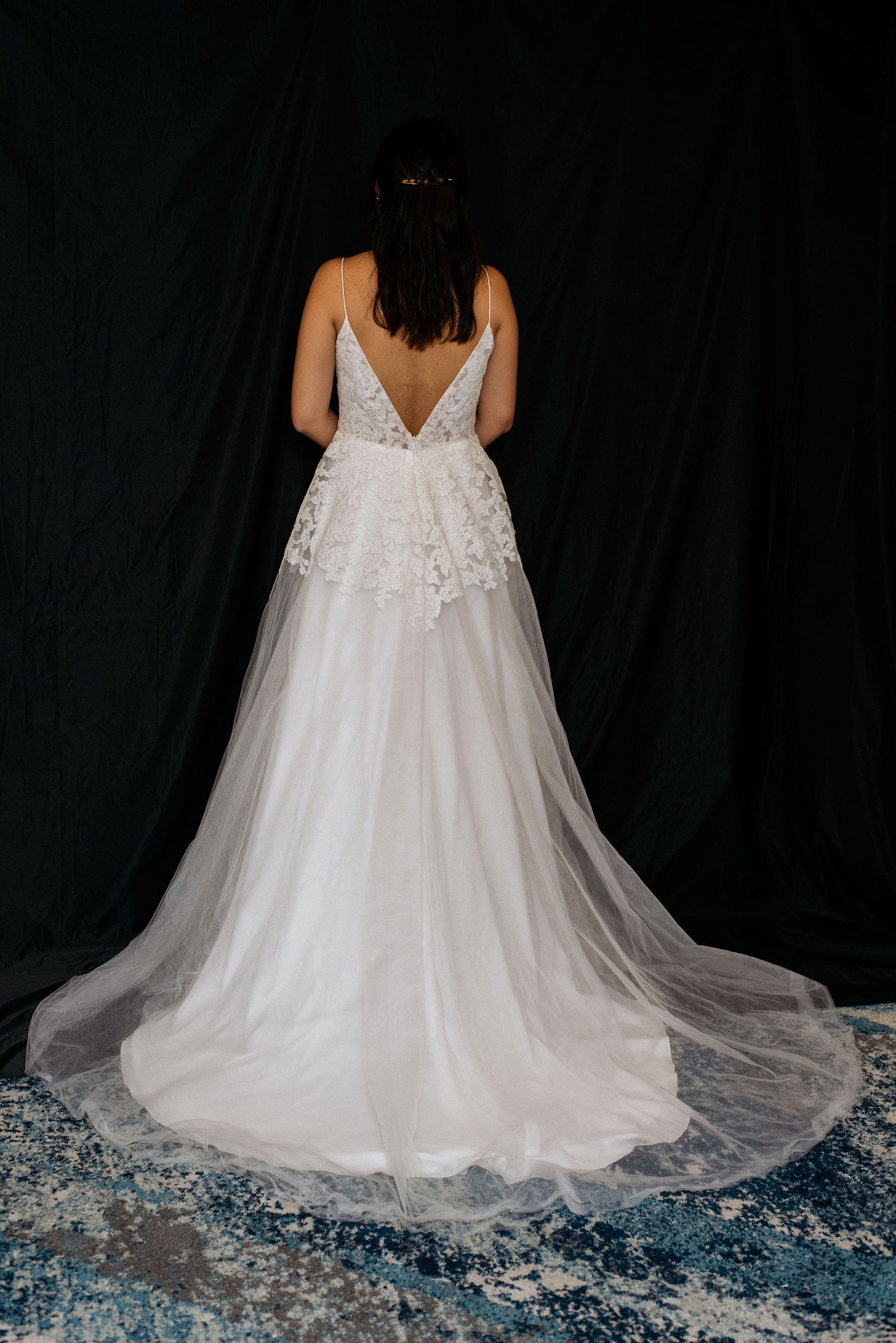 Because sizing scales vary so much, we have standardized our sizing by waist measurement. We personally measure each dress when it comes into the shop and we also estimate the amount that the dress can be sized up or down in alterations based on advice from the seamstresses that we work with.