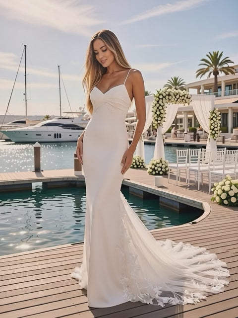 An asymmetrical pleated sweetheart neckline frames the décolletage with soft structure, while delicate, unembellished lace motifs accent the side bodice for a touch of heirloom romance. Slender spaghetti straps lead to a dramatic plunging V-back with pleated keyhole detail - creating a striking exit moment worthy of any black-tie celebration.