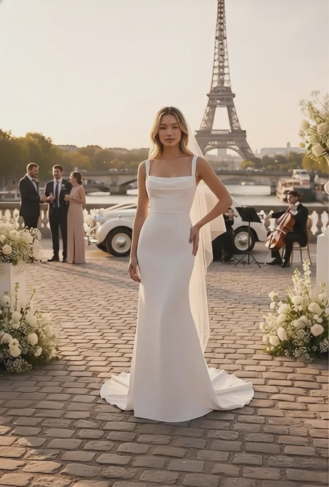 This modern sheath wedding dress is the definition of effortless elegance. Crafted from luxurious stretch crepe, it gently contours the body for a sleek, flattering fit. A softly draped cowl neckline and minimalist tank straps create a clean, contemporary silhouette that feels both timeless and chic. Designed for the bride who values simplicity with impact, this gown moves beautifully from ceremony to celebration.