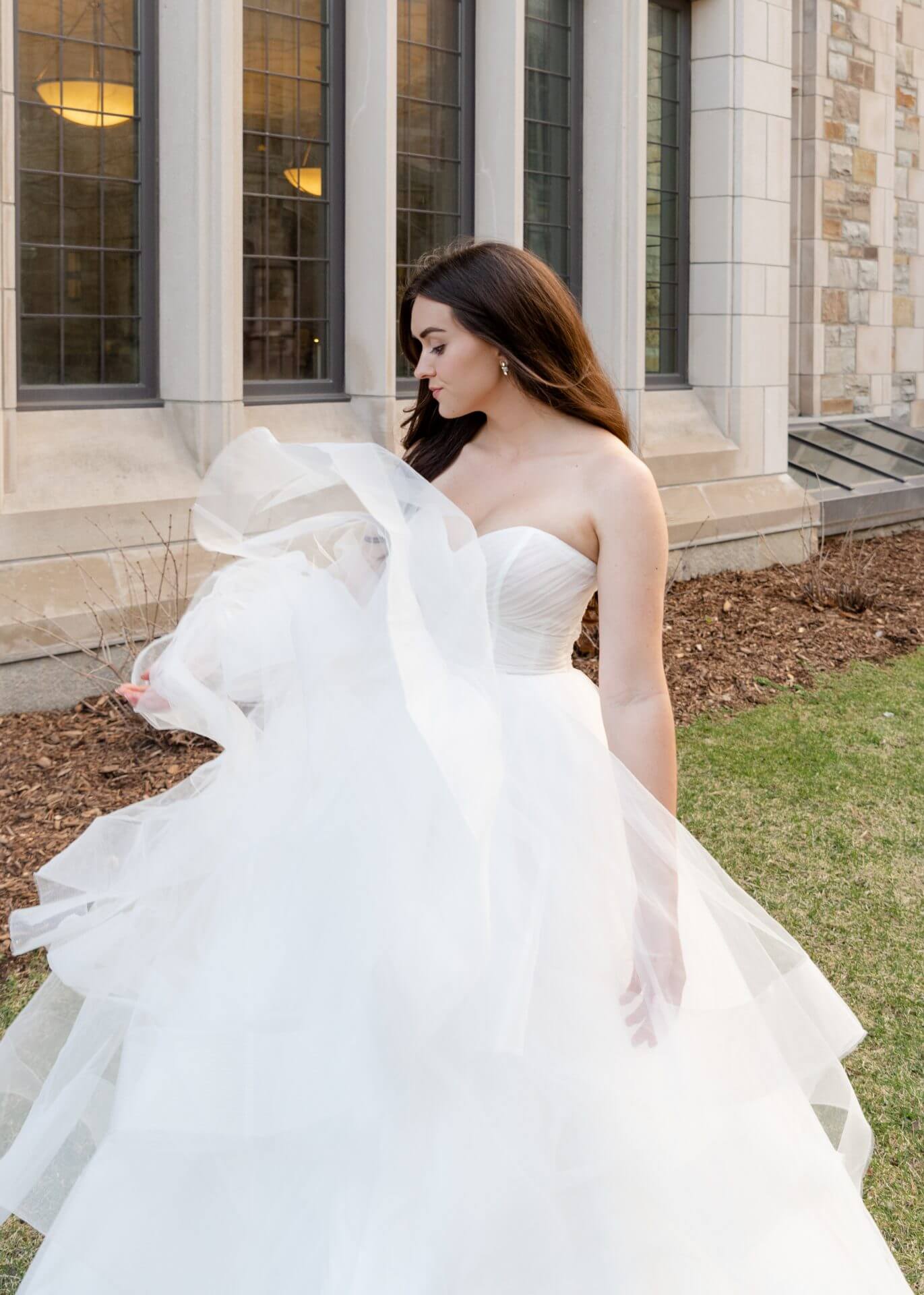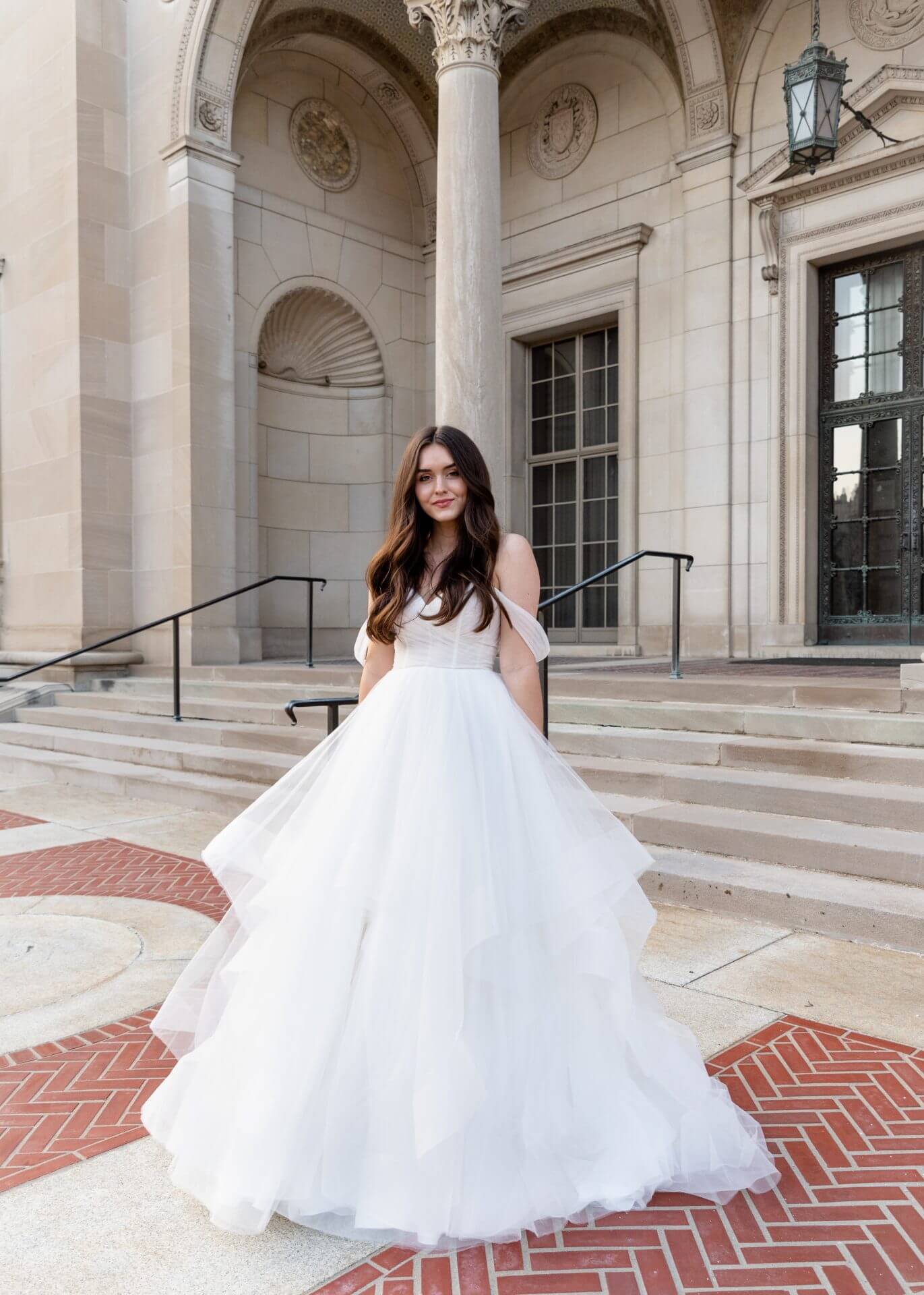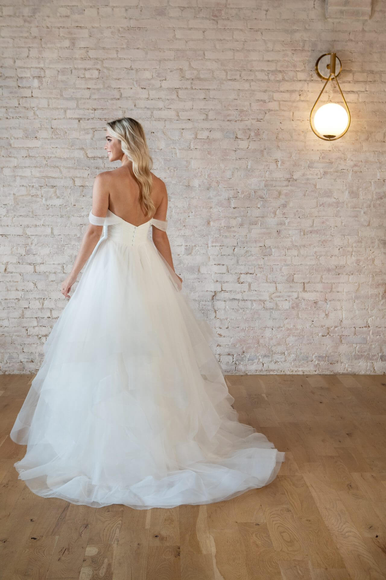 A clean and simple aesthetic turns up the volume with layers of sheer dreamy tulle in Style 7600. This plus size ballgown combines chic fashion with whimsical romance. The softly ruched sweetheart bodice comes lined or unlined for a sexy sheer finish or a modest touch. Delicate off-the-shoulder sleeves detach for a fashion-forward wedding gown that can be worn strapless. Finally, the dreamy and voluminous tiered ballgown skirt is formed from layers and layers of tulle to create luxurious tiers before unfolding into a soft sweeping train to catch every eye on your special day.