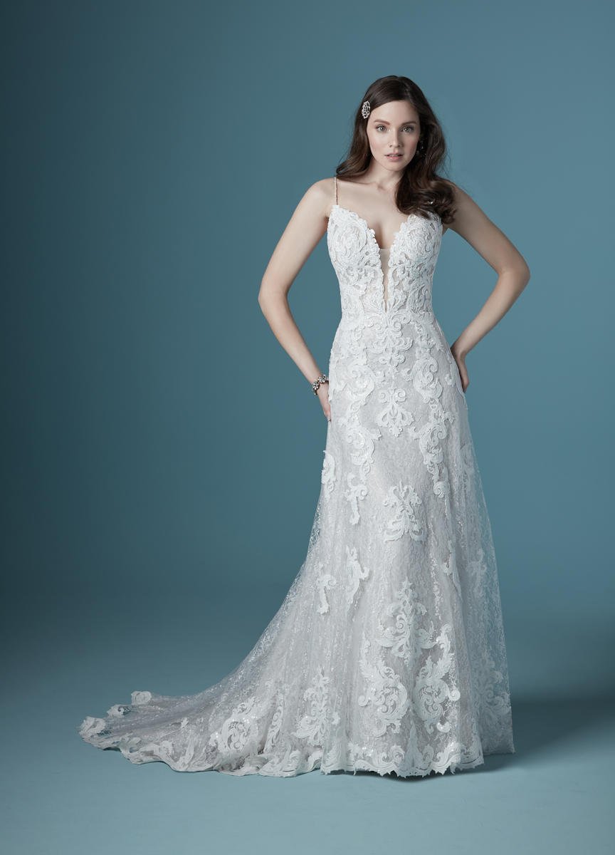 A shimmering lace A-line wedding dress featuring gorgeous lace motifs, evoking an elegant romance for the modern bride. Complete with a beaded lace bodice and plunging illusion V-neckline, further adding to the delicate beauty of the gown.