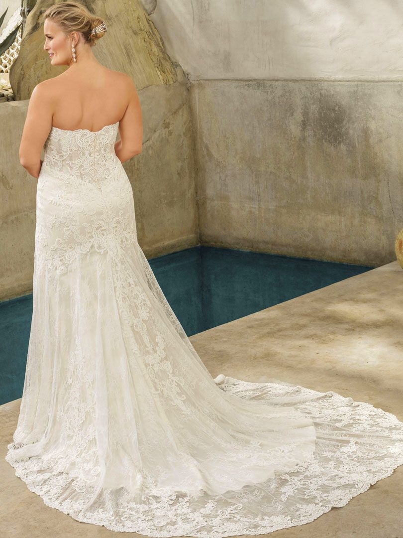 Varying scales of lace combine in a unique way across the strapless, fit and flare frame of Style 2294 Avery. The perfecting satin underlay simply reaches a chapel length, while Chantilly lace fans out in a semi-cathedral length addition. The option of a removable panel reveals an illusion back. New Dress!