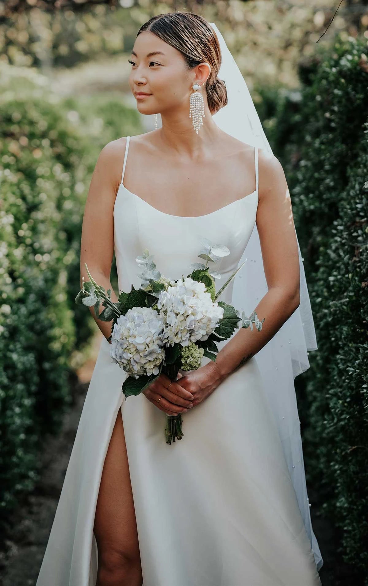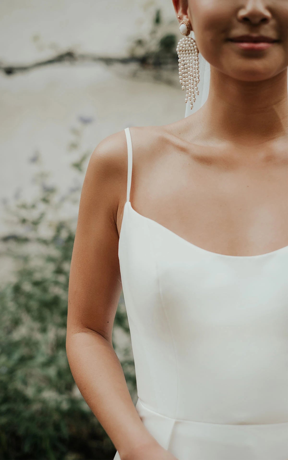 Style D3460 redefines modern minimalism with timeless grace. A softly rounded neckline and dramatically scooped open back pay homage to Old Hollywood glamour, refined for today’s bride. Wide-set straps offer effortless support while sweetly framing the open back. Chic side cutouts are subtly veiled in illusion tulle, adding support without sacrificing the clean silhouette. The skirt is gently voluminous with hidden pockets for that perfect touch of practicality, while a daring side slit delivers a show-stopping moment—elegant, sexy, and full of movement. Finishing the look, fabric-covered buttons cascade down the entire length of the skirt to the hem of the train, creating an unforgettable bridal finish.
