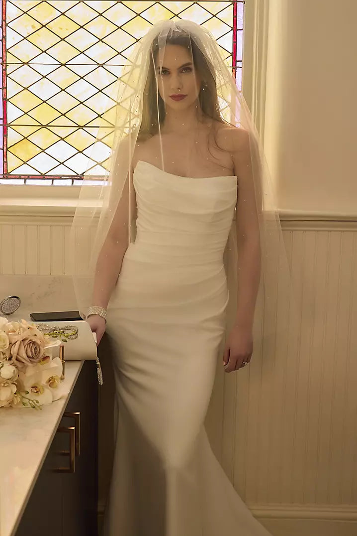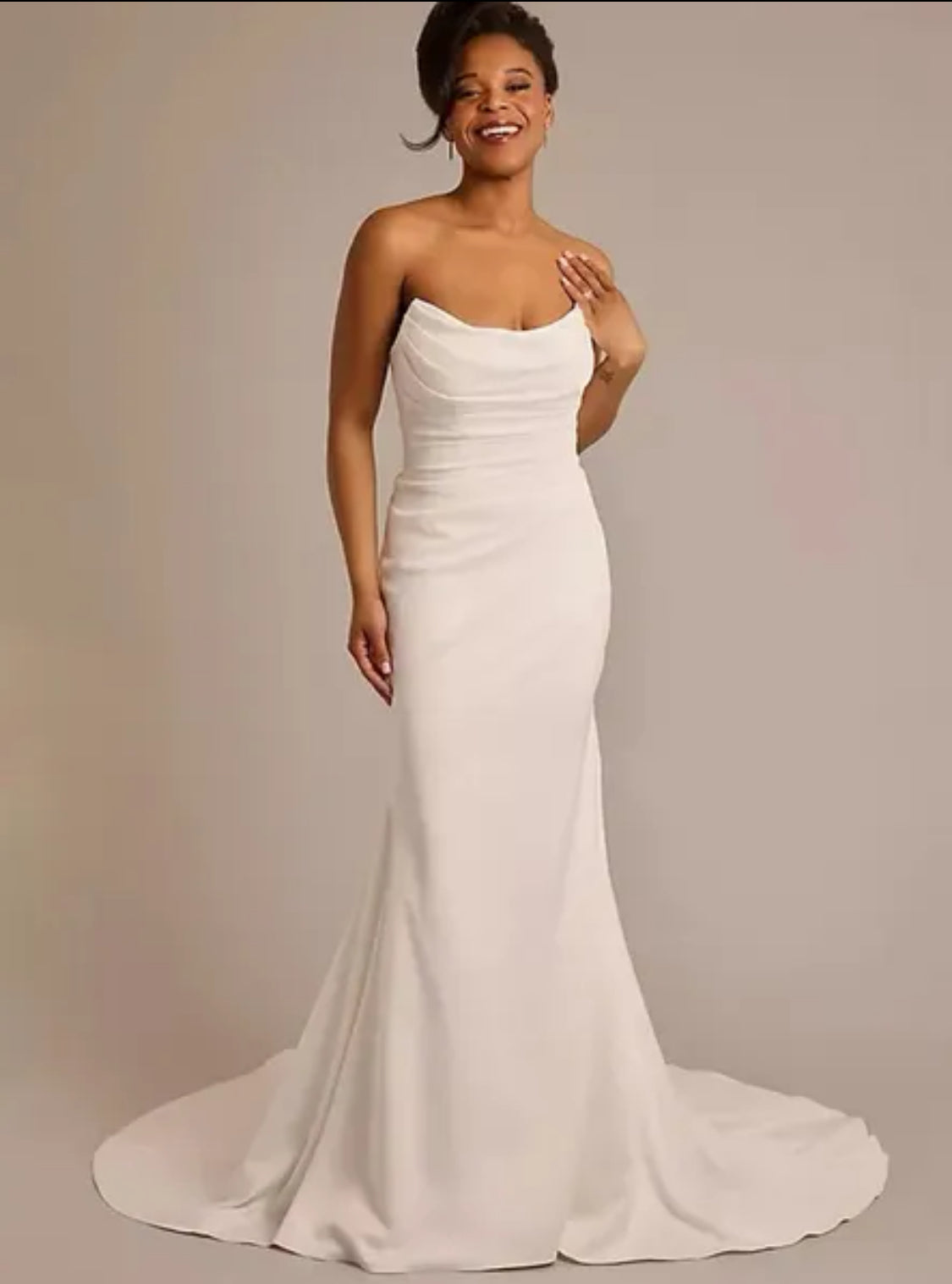 This elegant Strapless Draped Satin Mermaid Wedding Dress by Galina features a sleek, form-fitting design that gracefully flares into a stunning train. Crafted from luxurious satin, the dress showcases a sophisticated draped bodice that accentuates the figure, perfect for a timeless and chic look.