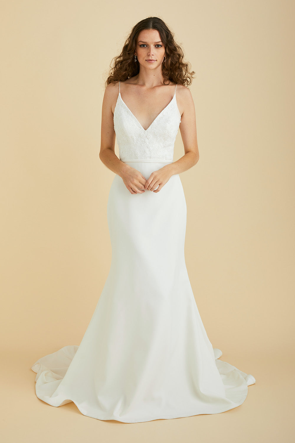 Feel every inch a bridal siren wearing this fluted wedding gown! Overlaid in subtly sparkling, wildflower-embroidered net, Primrose’s tailored camisole bodice segues to a sheer V-back. A curve-skimming skirt of supple crepe spills from the natural waist into a dramatic, gored chapel train. Primrose is shown in off-white.