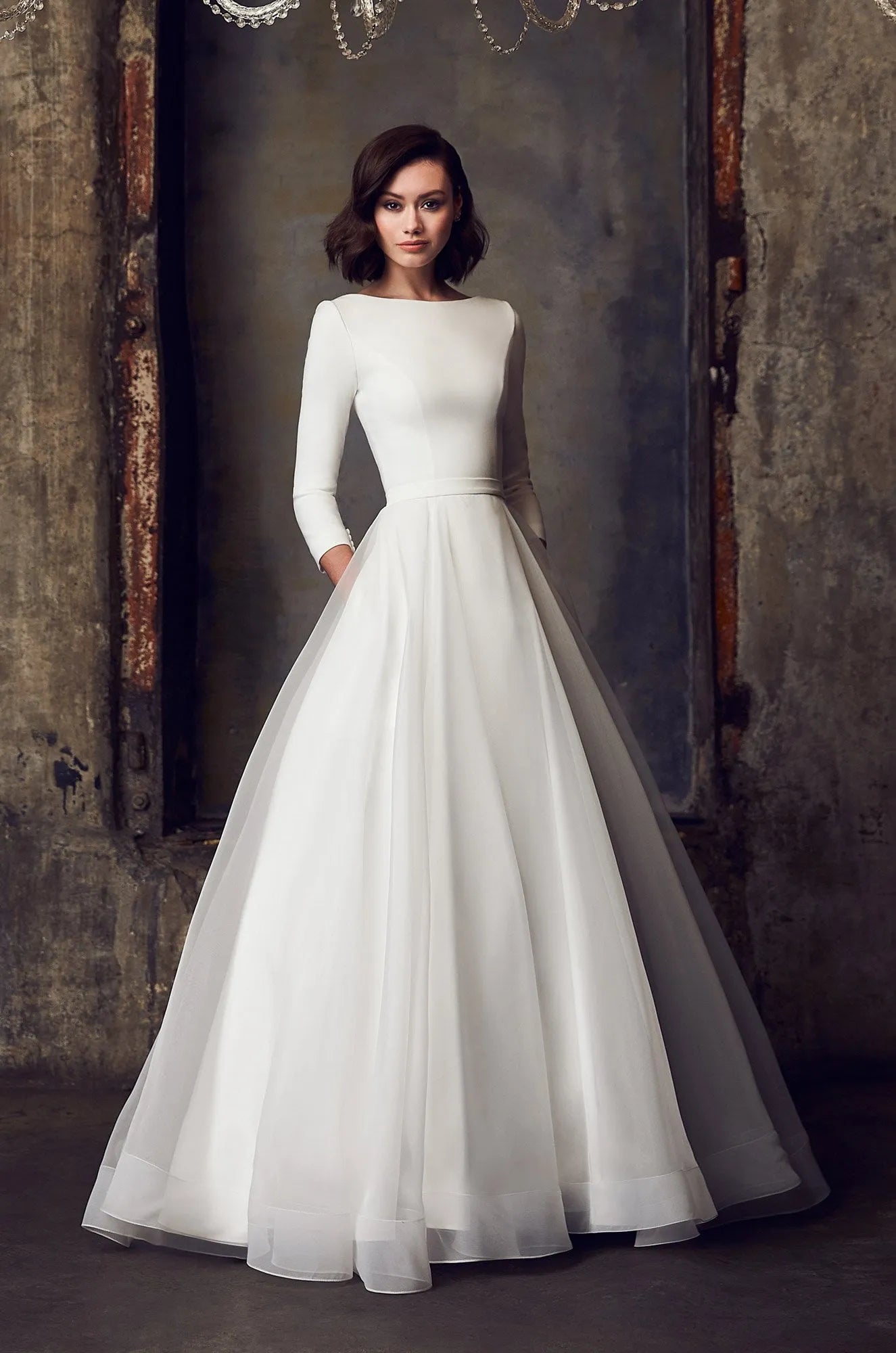 Classic minimalist meets modern-day princess. The simplicity of this gown is a statement in itself. Featuring a Crepe bodice with bateau neckline, ¾ length sleeves, and a full Organza skirt, this princess-inspired gown is elegant, magnificent, and beautifully polished. Small details such as the fabric covered buttons and loop closures on the sleeve hem add to the romance of the dress while ensuring a tailored look. The gown also features signature-style Mikaella pockets.