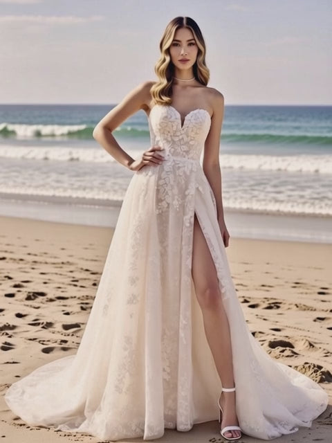 Chelsea by Maggie Sottero blends cottagecore romance with modern allure. Floral lace drapes softly over luminous tulle, while the sweetheart neckline adds timeless femininity. A thigh-high slit brings effortless sex appeal, making this gown perfect for the bride dreaming of a woodsy, garden, or seaside I do.