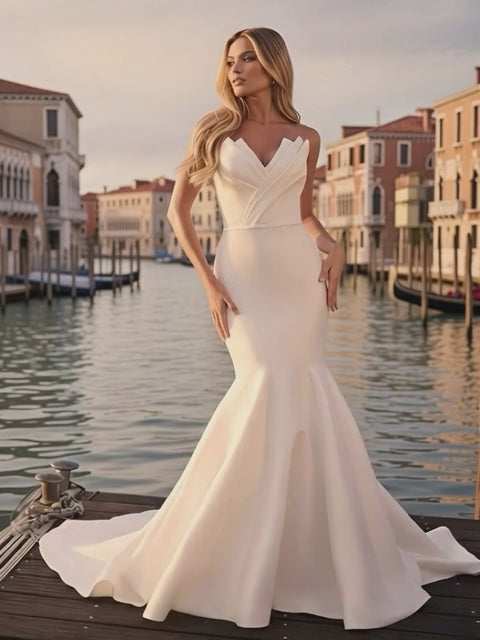 A refined expression of modern bridal elegance, Marilyn by Sottero & Midgley is designed for the bride who appreciates clean lines and contemporary sophistication. Crafted in luxurious satin, this strapless mermaid gown features architectural pleating that enhances the silhouette while maintaining an effortlessly polished look.